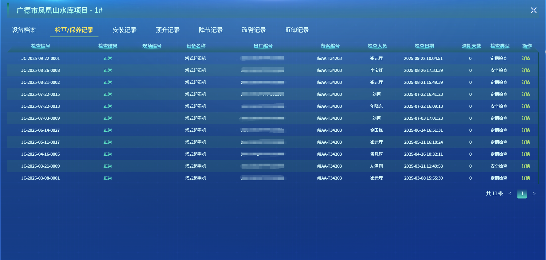 公司聚焦設(shè)備安拆、腳手架搭設(shè)等重點環(huán)節(jié),開展多輪檢查,對排查出的隱患全部建檔管理,查出隱患問題100余條,實現(xiàn)整改閉環(huán)率100%。依托數(shù)智化管理平臺,完成設(shè)備安拆、維修保養(yǎng)等關(guān)鍵數(shù)據(jù)錄入,并在多個項目推廣應用智能監(jiān)控系統(tǒng),對塔吊、施工升降機等設(shè)備進行實時監(jiān)測與風險預警,構(gòu)建“數(shù)據(jù)可查、過程可控、隱患可溯”的現(xiàn)代化質(zhì)量管理體系。